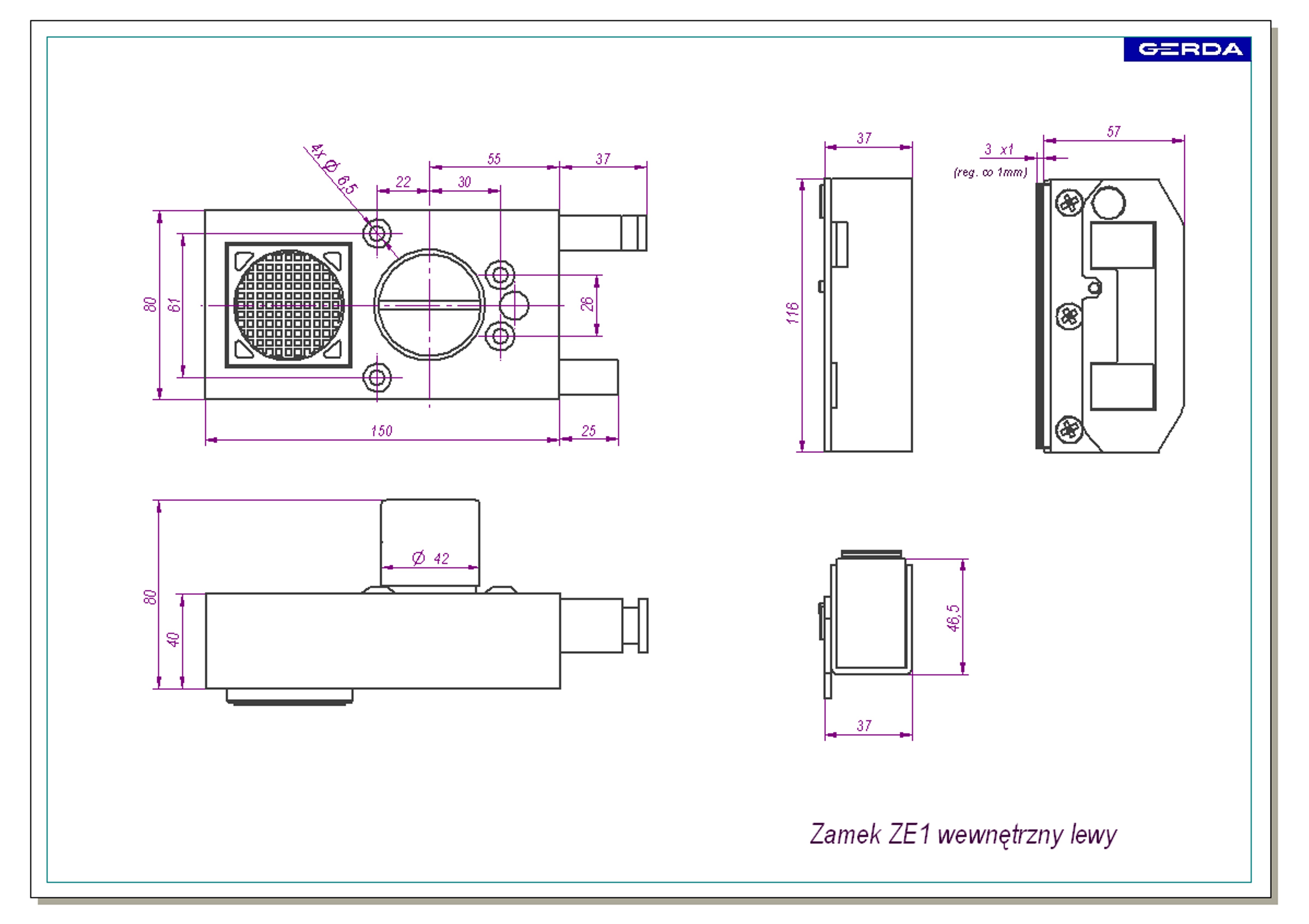 Najwyższej klasy zamek GERDA ZE-1 do drzwi, atestowany z alarmem. Zamek posiada wyjątkowo silną i odporną konstrukcję. Dwa stalowe prostokątne rygle o wysokim wskaźniku wytrzymałości są w stanie stawić opór nawet przy użyciu łomu. Wbudowany przeciążeniowy alarm zasilany bateryjnie uruchamia się przy próbie włamania, kiedy siła nacisku przekroczy wartość 50 kg. Istnieje możliwość podłączenia zamka do centralnego alarmu za pośrednictwem gniazda umieszczonego w obudowie. Do kupienia wersja lewa i prawa do drzwi zewnętrznych i wewnętrznych