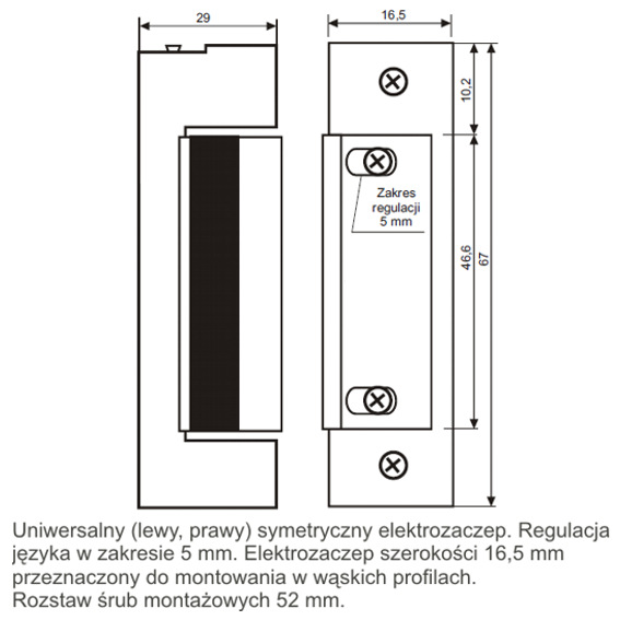 Elektrozaczep może być montowany bezpośrednio w ościeżnicy (słupku furtki, kraty) lub za pomocą dodatkowych blach zaczepowych (szyldów). Wąski korpus 16,5 mm umożliwia montowanie elektorzaczepu w cienkich profilach aluminiowych. Rozstaw śrub mocujących 52 mm.